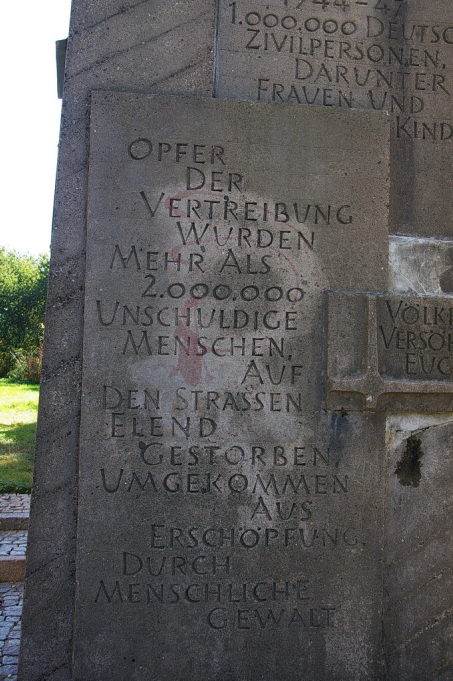 Das Heimkehrer Mahnmal, „Völker, entsaget dem Hass – versöhnt Euch, dienet dem Frieden – baut Brücken zueinander“.