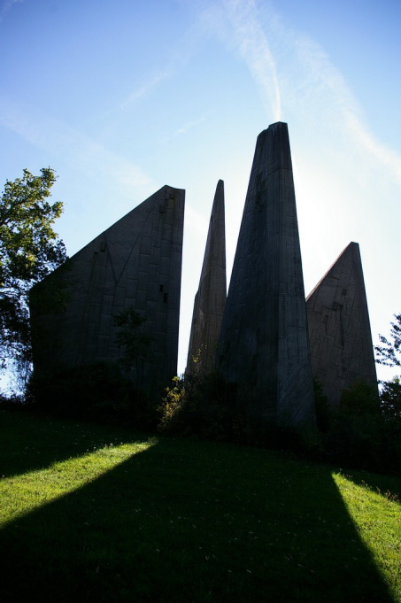 Das Heimkehrer Mahnmal, „Völker, entsaget dem Hass – versöhnt Euch, dienet dem Frieden – baut Brücken zueinander“.