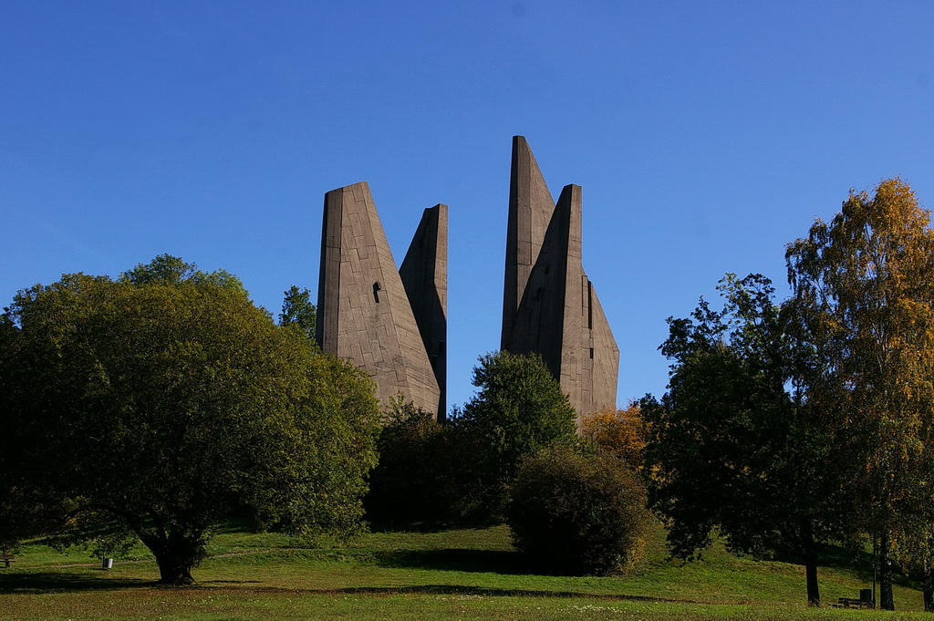 Das Heimkehrer Mahnmal, „Völker, entsaget dem Hass – versöhnt Euch, dienet dem Frieden – baut Brücken zueinander“.