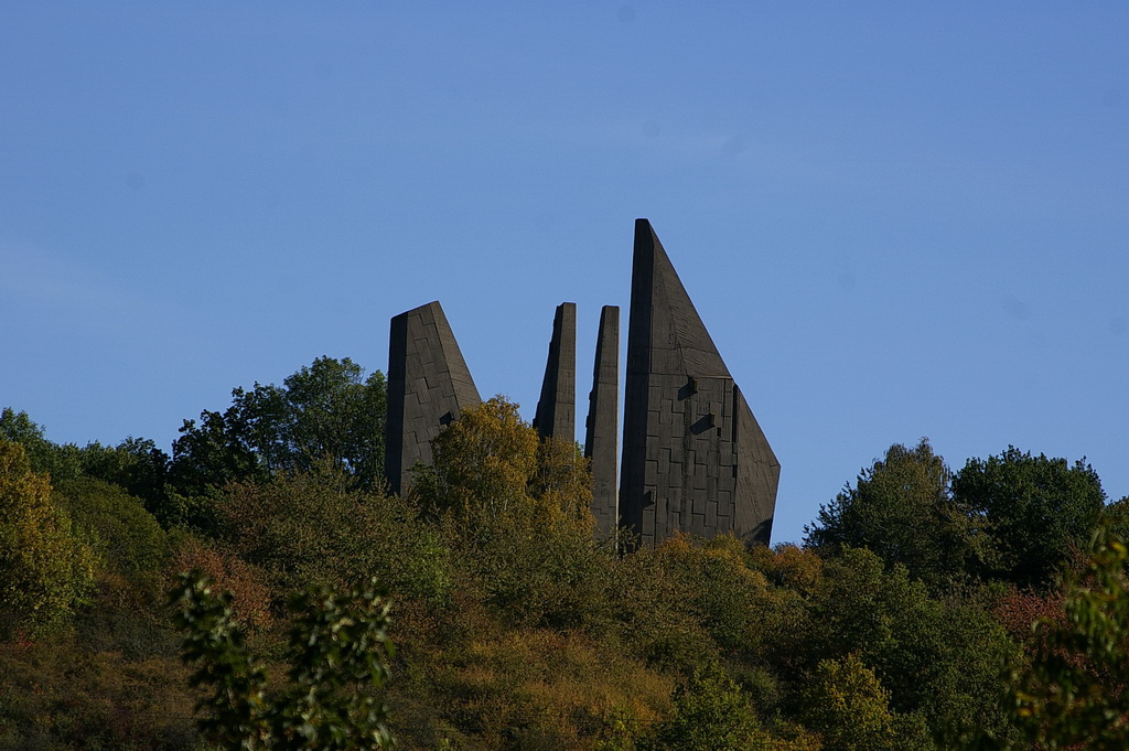 Das Heimkehrer Mahnmal, „Völker, entsaget dem Hass – versöhnt Euch, dienet dem Frieden – baut Brücken zueinander“.