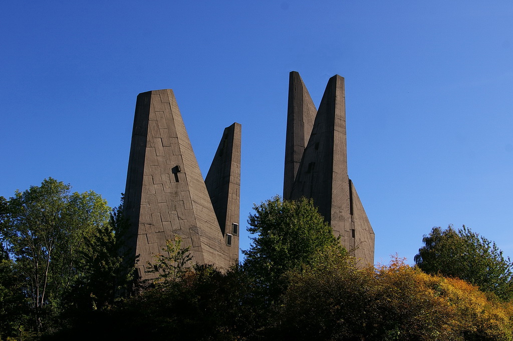 Das Heimkehrer Mahnmal, „Völker, entsaget dem Hass – versöhnt Euch, dienet dem Frieden – baut Brücken zueinander“.